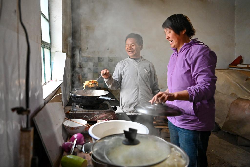↑村民程娇梅(右)为秦海松准备午饭(2025年10月11日摄)。