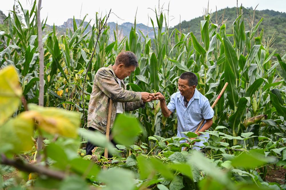↑村民桑建平(左)通过手势告诉秦海松野草和蔬菜的区别(2025年8月27日摄)。