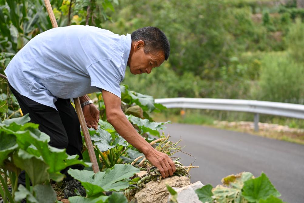 ↑秦海松帮助村民收获蔬菜(2025年8月27日摄)。