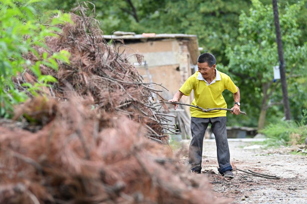 ↑秦海松为村民元有才整理柴火(2025年8月6日摄)。