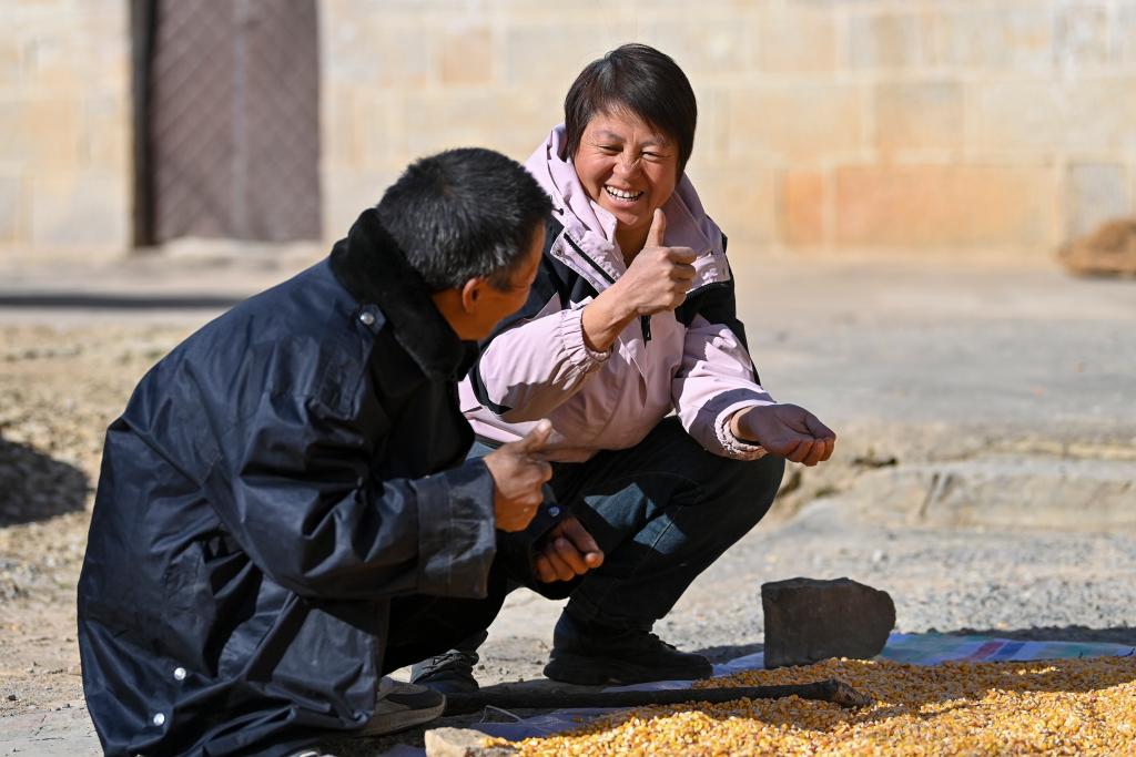 ↑村民程娇梅(右)向帮忙捡玉米的秦海松表达感谢(2025年12月1日摄)。