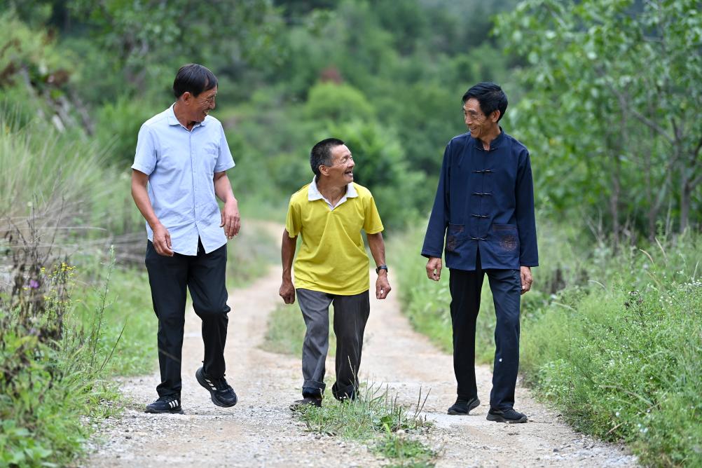 ↑村干部申广军(左)、村民桑建国(右)送秦海松到照顾他的下一户村民家(2025年8月6日摄)。