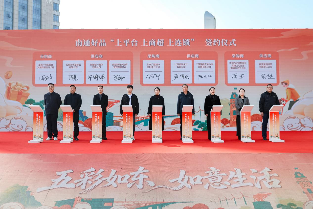 现场共同见证了南通好品“上平台、上商超、上连锁”签约仪式。两轮签约,17家企业代表登台,有优质“土特产”链入终端、有渠道资源优化整合、有品牌联动跨界升级。