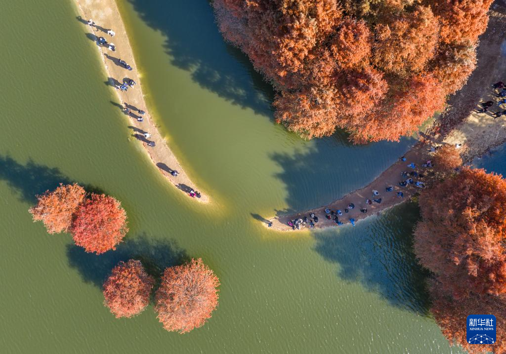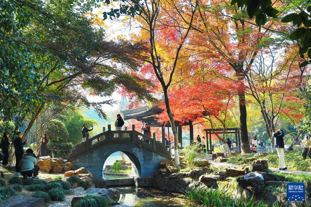 12月8日,游客在浙江省嘉兴市南湖景区湖心岛观赏枫叶。