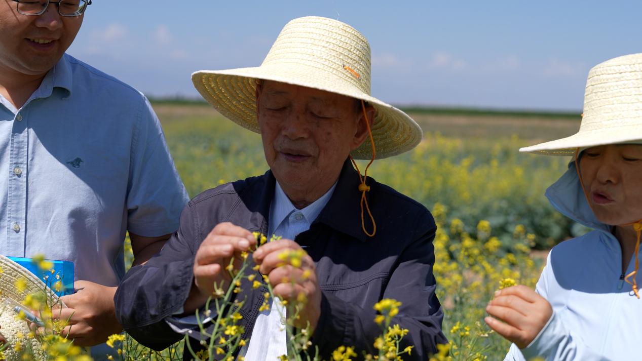 2007年,傅廷栋团队在江苏盐碱滩试种油菜成功,更坚定了这个想法。于是,团队把新疆的严酷环境“搬”进实验室,让成千上万颗种子在盐水中“闯关”。九年时间里,不知道多少种子在实验室里死去活来,直到2019年,“华油杂158”这些耐盐碱新品种终于破土而出,在新疆奇台的白碱滩上开出了金黄的花朵。数据显示,这些油菜每亩每年还能带走6-8公斤的盐。耐盐碱油菜新品种,以柔软根系撬动了坚硬盐壳,成为了解锁了这片“不毛地”的“金钥匙”。