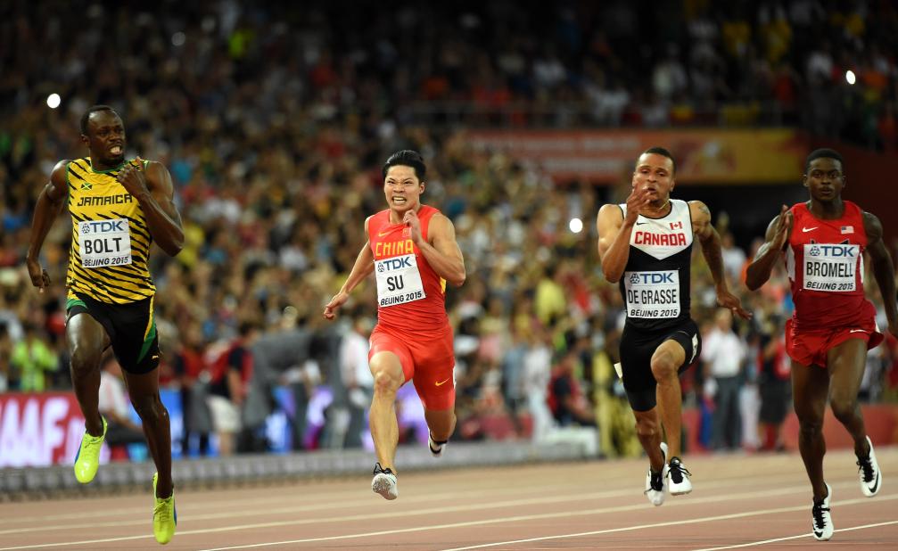 2015年8月23日,苏炳添(左二)与博尔特(左一)在世界田径锦标赛男子100米半决赛中。苏炳添以9秒99的成绩晋级决赛。新华社记者李钢摄