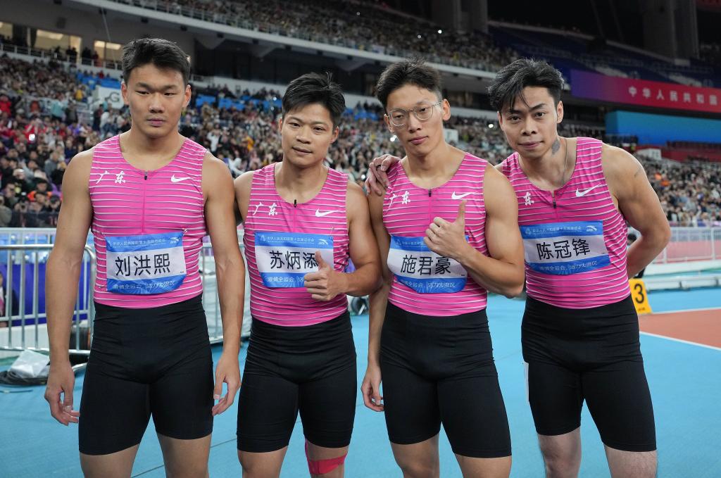 11月20日,广东队选手刘洪熙、苏炳添、施君豪、陈冠锋(从左至右)在第十五届全国运动会田径男子4X100米接力决赛后。新华社记者江汉摄