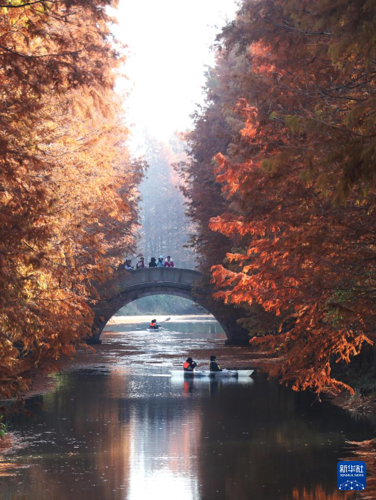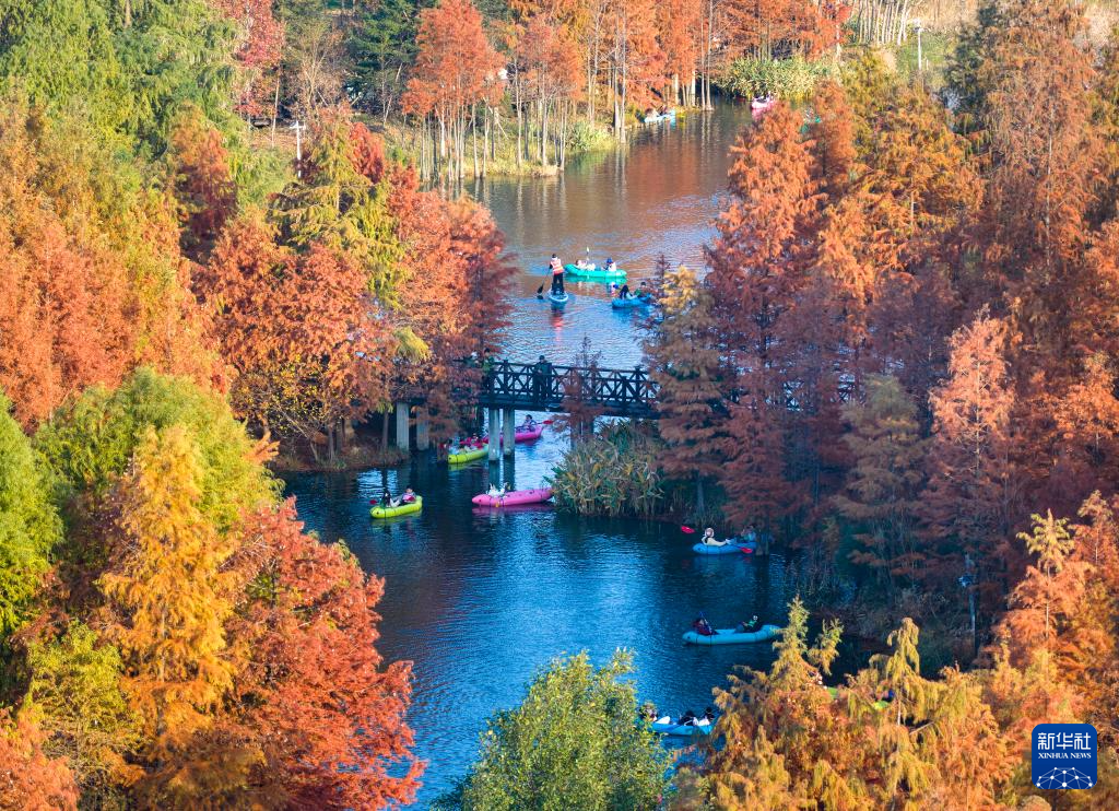 12月14日,人们在浙江省宁波植物园水杉林中挥桨戏水,乐享冬日暖阳(无人机照片)。