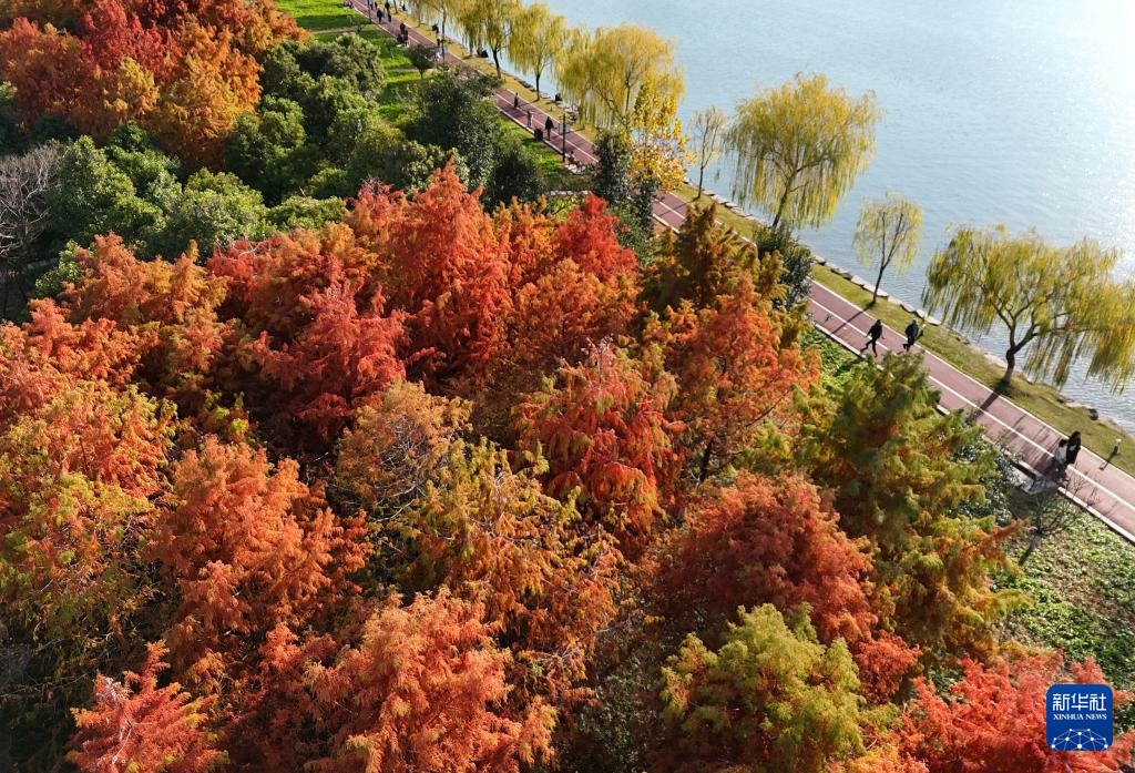 12月14日,游客在江苏常州红梅公园观赏枫叶美景。