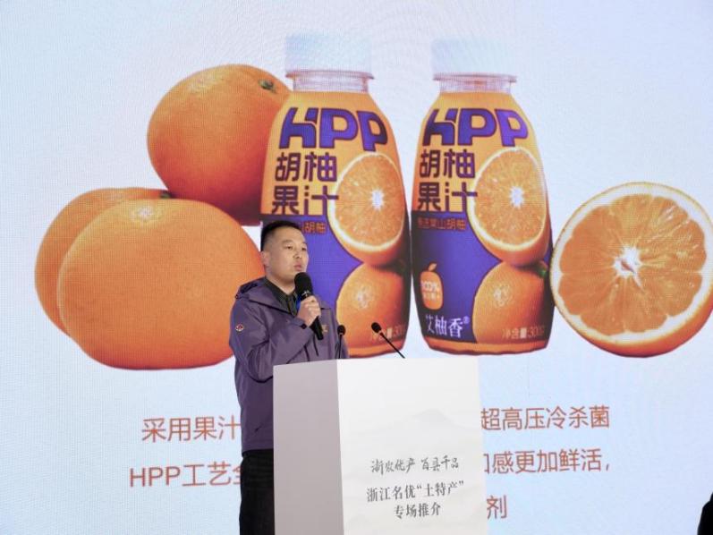 推介会现场,来自浙江多个县市的代表与龙头企业依次进行产品推介。鲜甜爆汁的象山红美人、甘甜软糯的武义宣莲、清甜脆嫩的玉环文旦等地域特色产品,展现了浙江“土特产”的鲜明风味。青莲黑猪肉、艾佳胡柚汁等企业代表,则从标准化生产、精深加工、品牌塑造等角度,呈现了浙江农业全链条发展的创新成果。