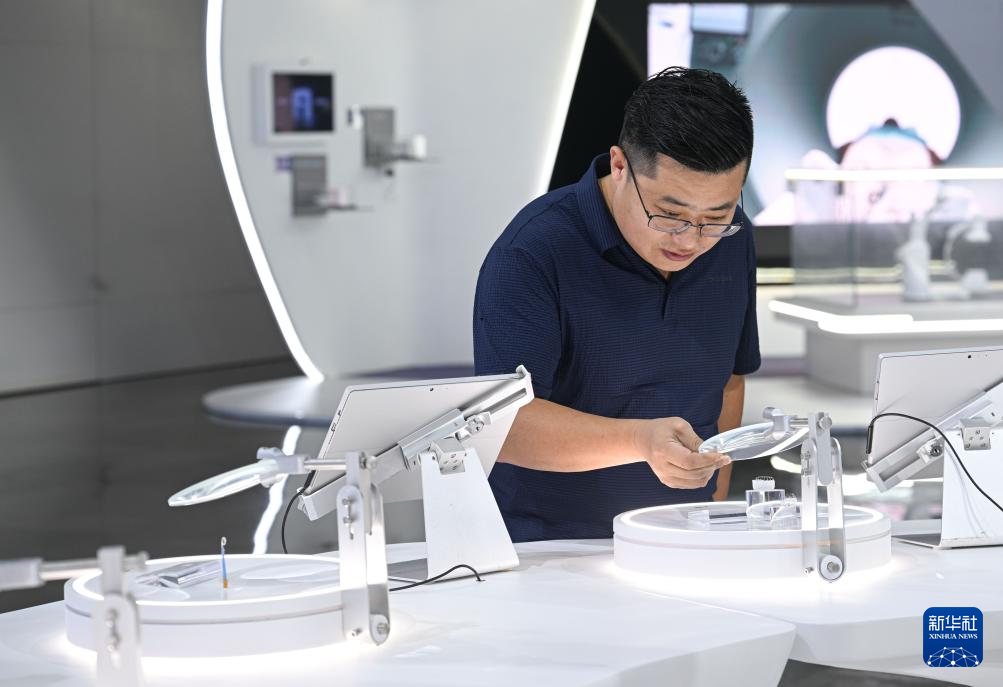 观众在海南自贸港重点园区——博鳌乐城国际医疗旅游先行区观看“永不落幕”国际创新药械展(10月27日摄)。