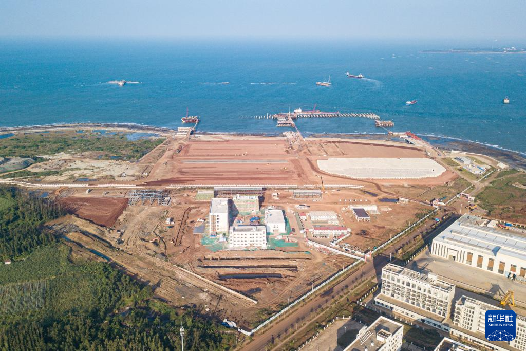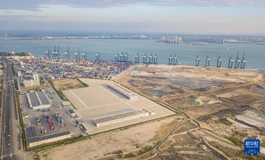 在海南自贸港重点园区——洋浦经济开发区拍摄的洋浦港封关运作项目和配套工程,远处是建设、发展中的洋浦国际集装箱码头(无人机照片,11月21日摄)。