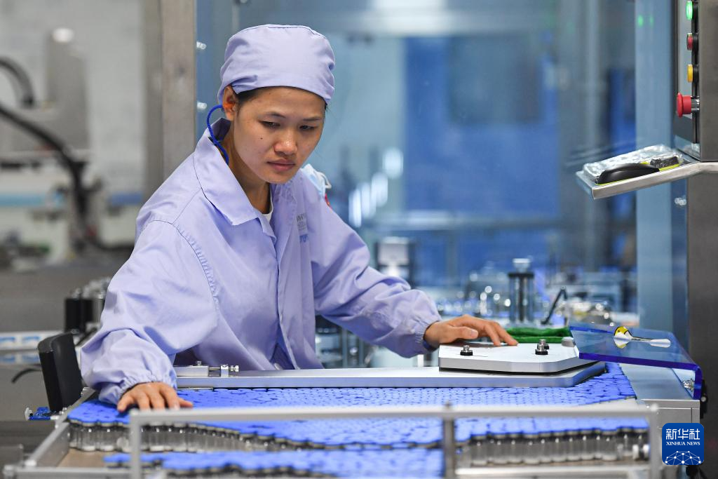 在海南自贸港重点园区——海口国家高新技术产业开发区药谷工业园,药企工人在车间生产药品(2021年6月17日摄)。