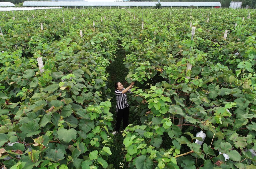 图为王卫花在葡萄园内疏枝。新华社记者邵瑞 摄