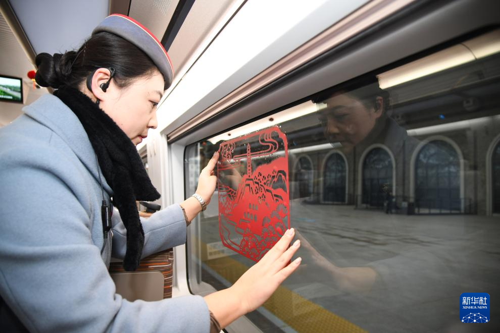 12月26日,在延安站,乘务员用剪纸装饰西延高铁首发列车车厢。