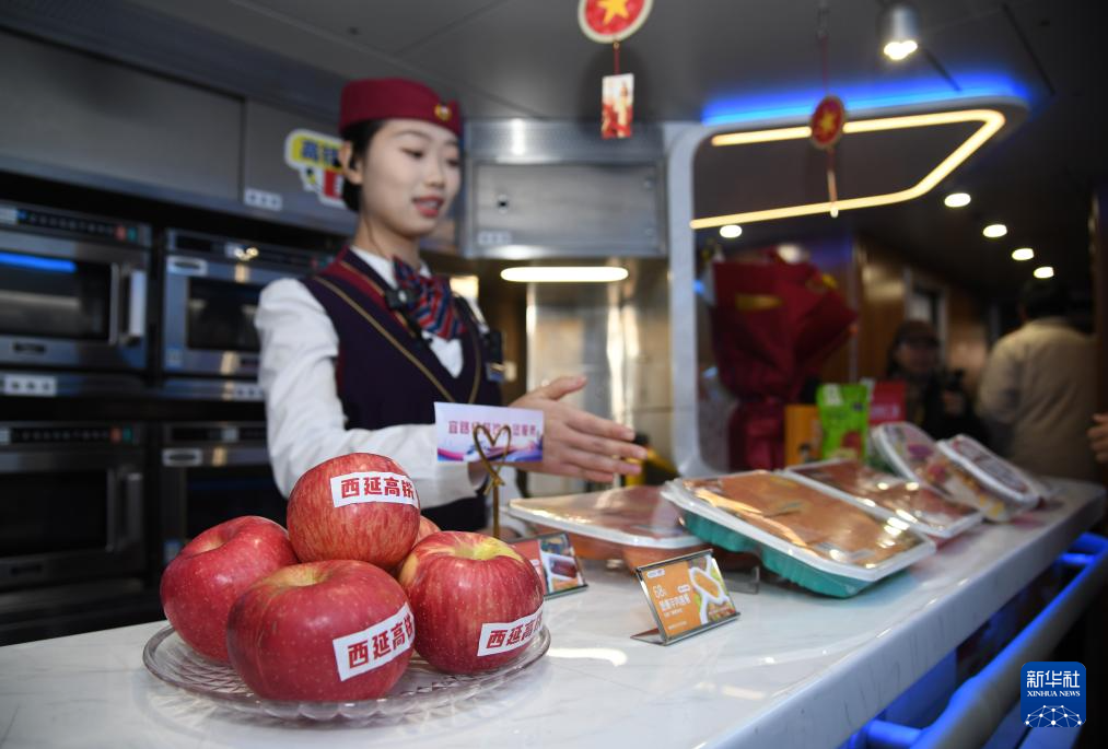 12月26日,乘务员在西延高铁首发列车上向乘客介绍延安特产。