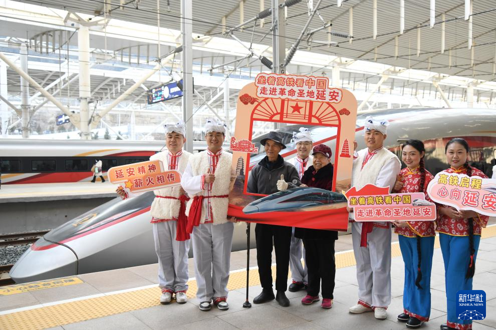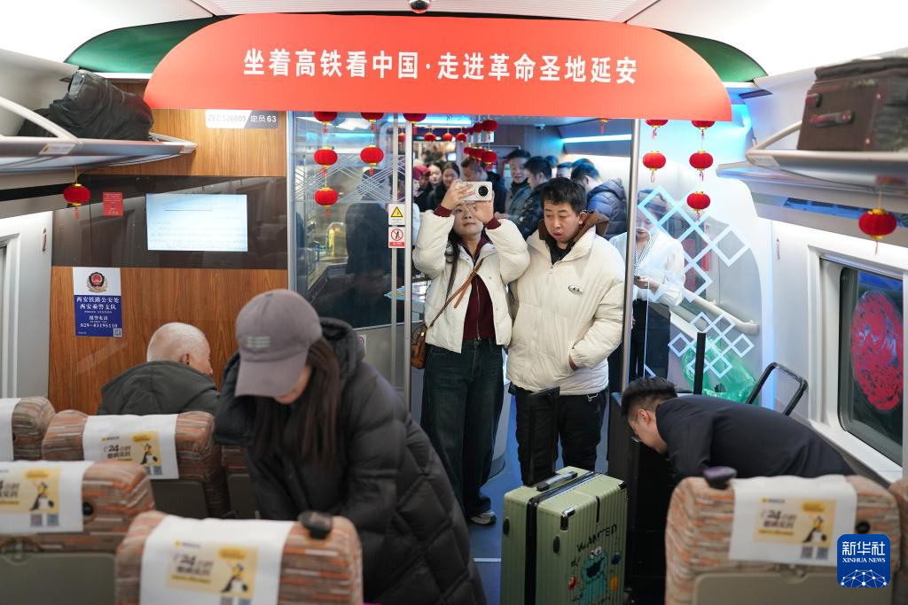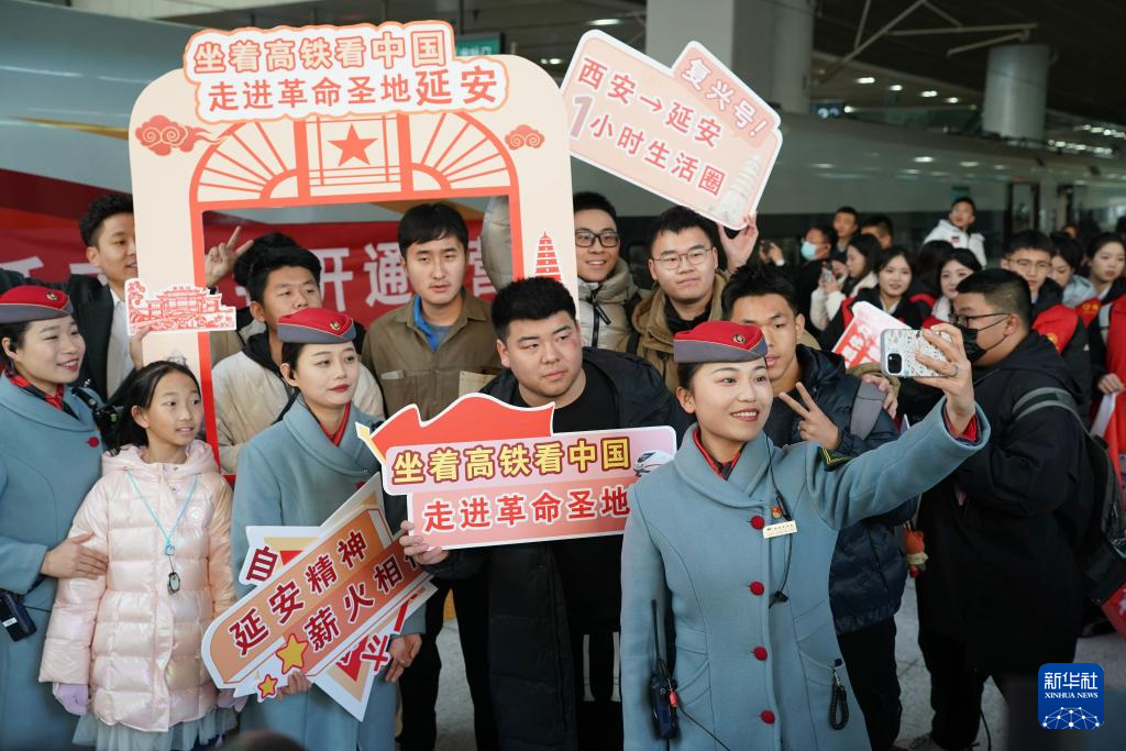 12月26日,乘客和乘务人员在西安开往延安的西延高铁C9312次首发列车前拍照留念。