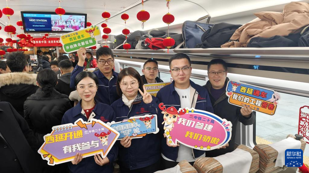 12月26日,建设者在延安站西延高铁首发列车上合影留念。