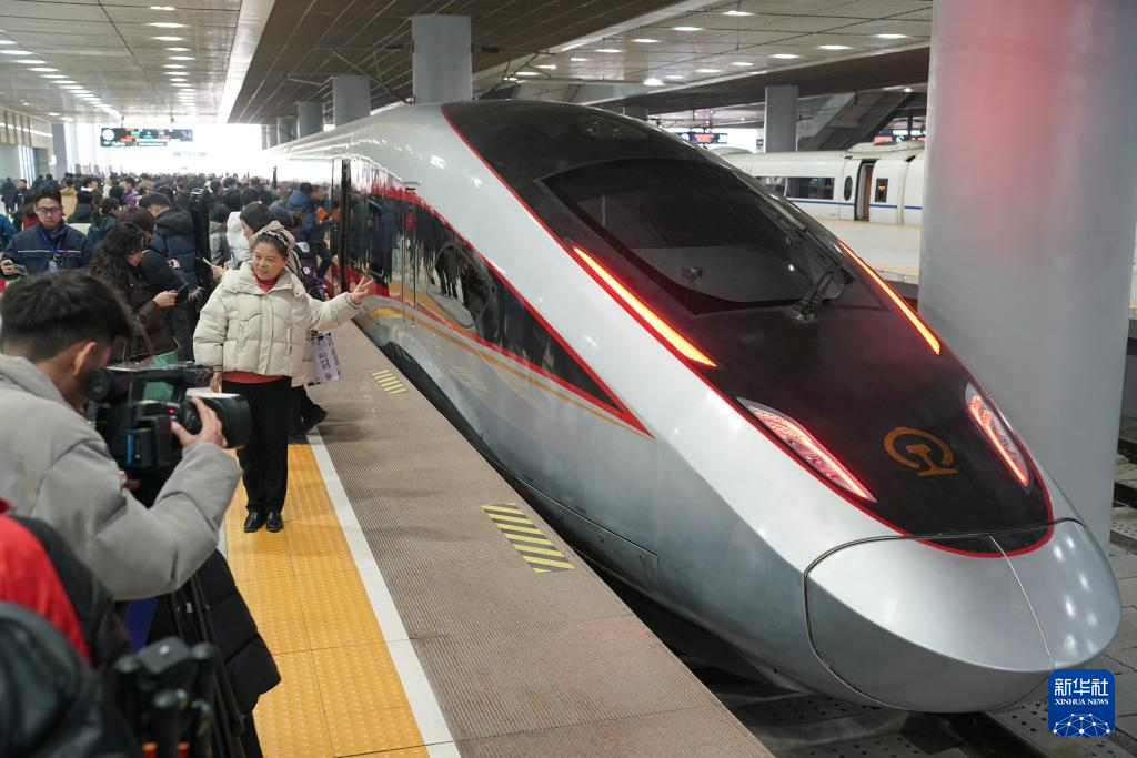 12月26日,在西安北站,乘客在西安开往延安的西延高铁C9312次首发列车前拍照留念。