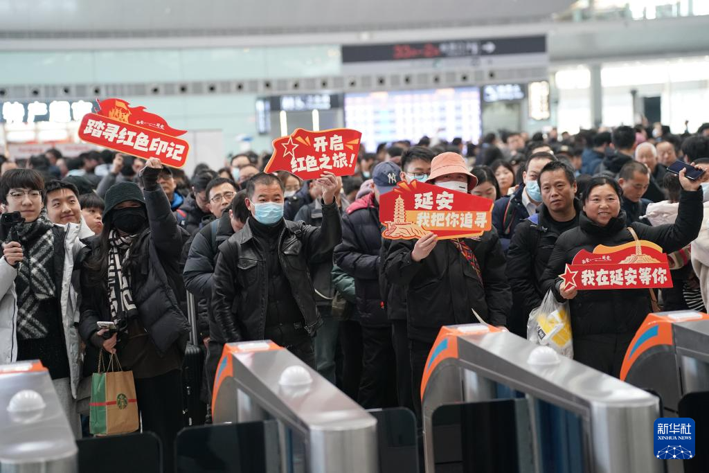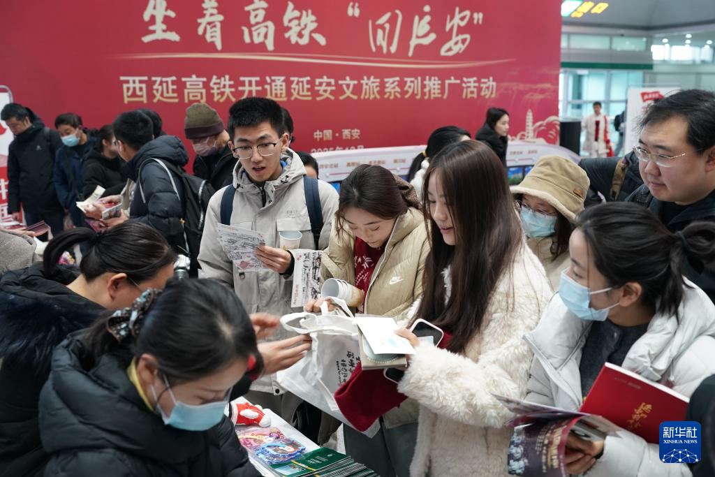 12月26日,在西安北站,乘客在西延高铁开通延安文旅系列推广活动上参观。