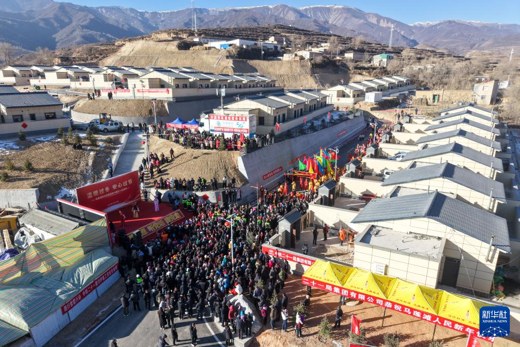 这是12月29日在榆中县马坡乡马莲滩村集中安置点拍摄的灾后重建集中搬迁入住活动现场(无人机照片)。