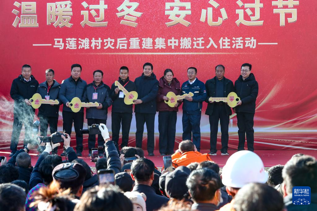 12月29日,在榆中县马坡乡马莲滩村灾后重建集中搬迁入住活动现场,建设单位代表与群众代表举行交付新房钥匙仪式。