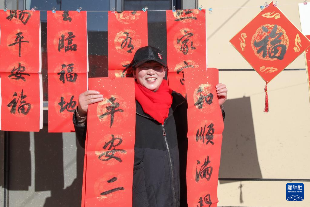 12月29日,村民在榆中县马坡乡马莲滩村灾后重建集中搬迁入住活动现场领取春联。