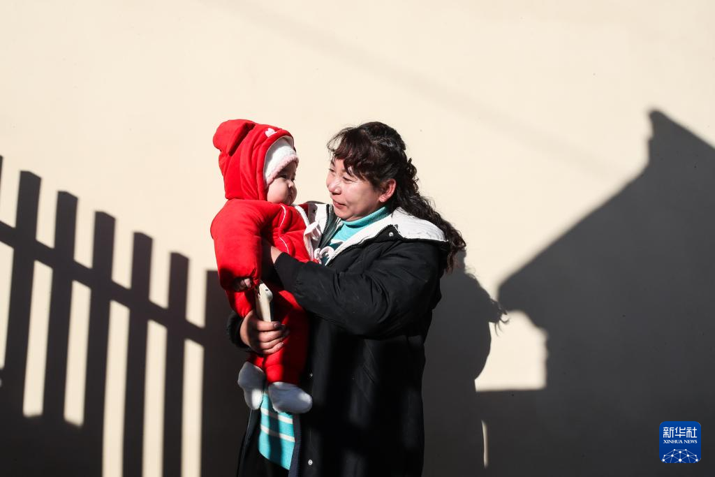 12月29日,村民抱着孙子在榆中县马坡乡马莲滩村集中安置点的新家晒太阳。