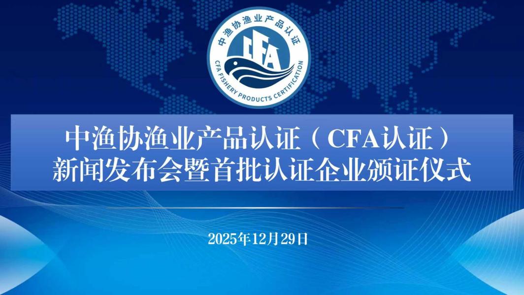 2025年12月29日下午,“中渔协渔业产品认证(CFA认证)”新闻发布会暨首批认证企业颁证仪式在北京中欧宾馆举行。本次活动由中国渔业协会与北京华思联认证中心共同主办,以“树立行业品质标杆,赋能产业绿色升级”为宗旨,正式推出具有中国特色的渔业产品认证体系,标志着我国渔业标准化与质量安全保障工作迈出关键一步。