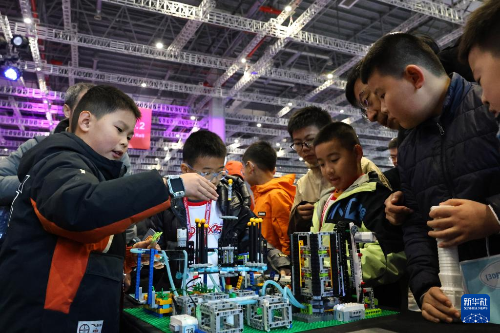 1月2日,一名小选手(左一)向参观者介绍他的创意编程作品。