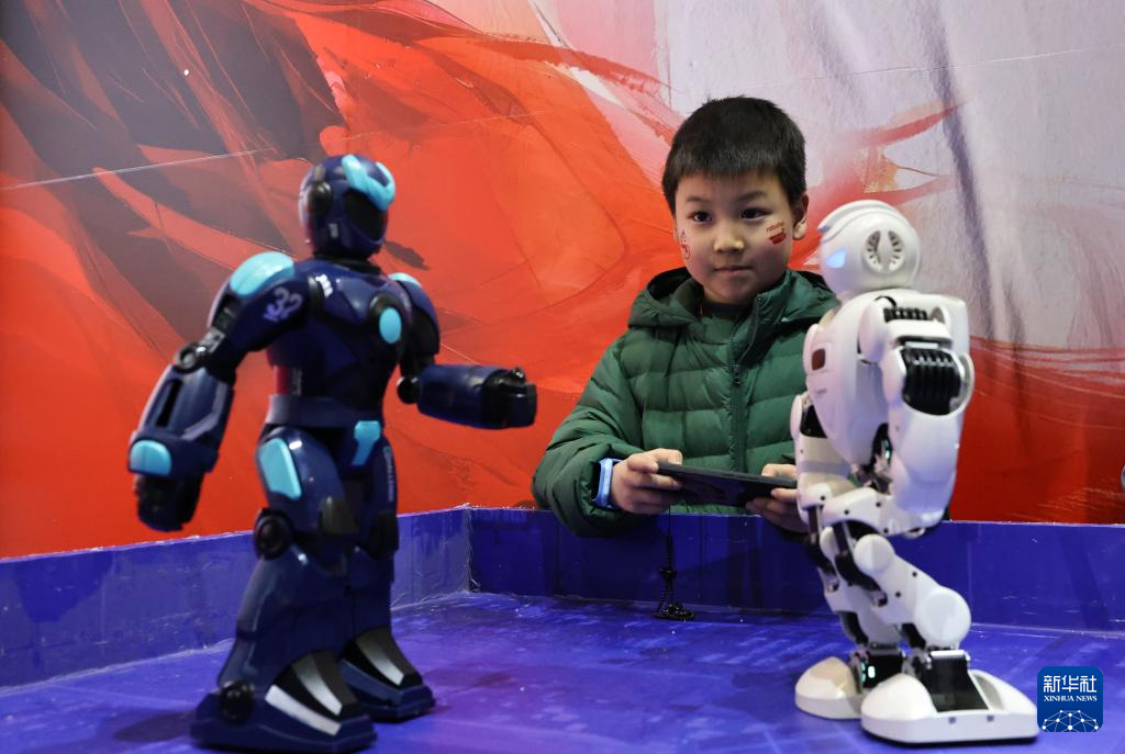 1月2日,参观者在体验操纵机器人进行格斗游戏。