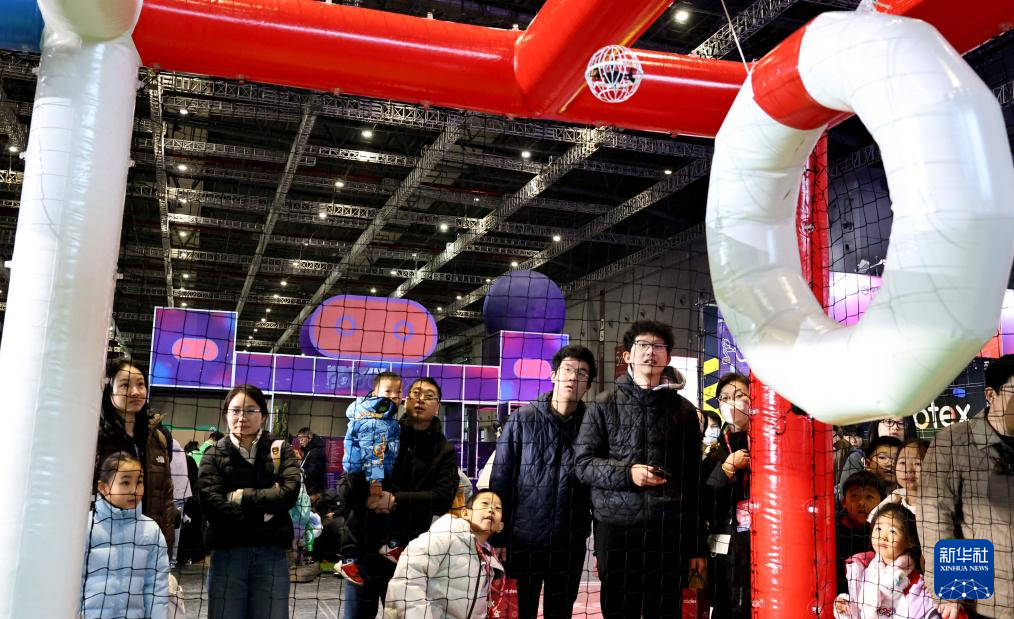 1月2日,参观者在观看无人机场地障碍穿越表演。