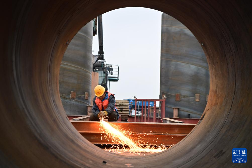 1月2日,工人在位于江苏省兴化经济开发区的中建七局宁盐高速泰州1标段钢筋加工场进行焊接作业(无人机照片)。