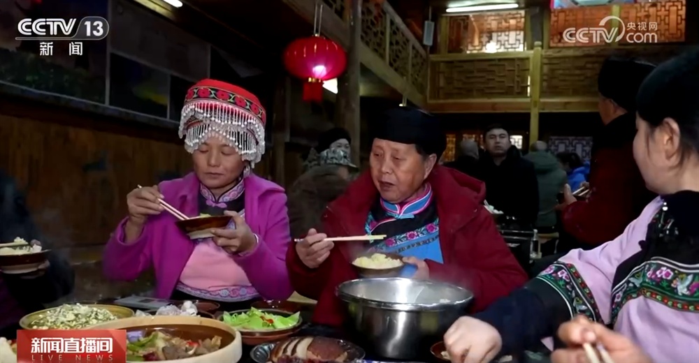 天色渐暗,大红灯笼被点亮,到了吃晚饭的时间,乡亲们围坐在一起吃刨汤宴、唱山歌,表达对彼此最真挚的祝福。