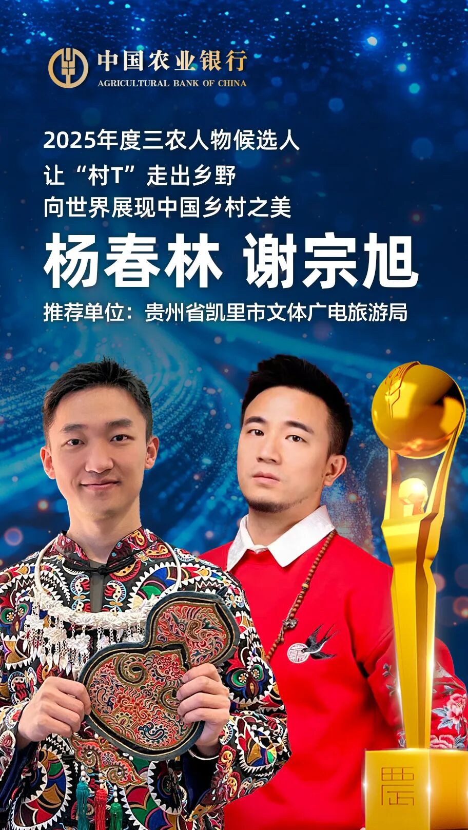 杨春林是贵州“村T”发起人、总策划,国潮服饰品牌“古阿新”创始人、苗族服装设计师、凯里市政协委员 。谢宗旭是世界“村T”联合发起人、清华大学水利系博士(兼修国际关系硕士)、国际青年外交与公益领域活跃者 。