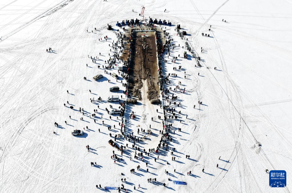 1月10日,市民和游客在冰面上观看冬捕(无人机照片)。