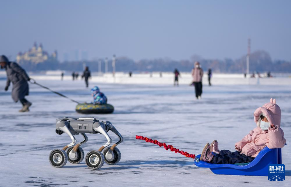 1月11日,小朋友在松花江哈尔滨段江面上体验机器狗拉爬犁。