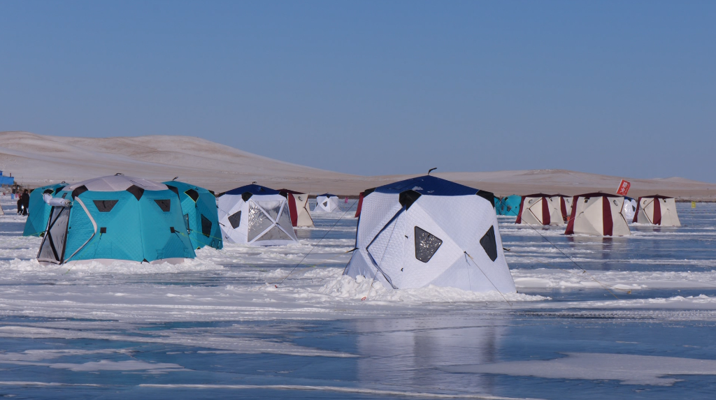 清晨的乌拉盖湖,冰层厚达数十厘米,如一块巨大的银镜铺展在天地间,脚下积雪踩上去“嘎吱”作响。冰面上,彩色保暖帐篷错落排开,像散落在雪原上的斑斓糖果。冰钻凿冰的“嗡嗡”声此起彼伏,冰屑飞溅间,钓友们弯腰调漂、挂饵,动作麻利。