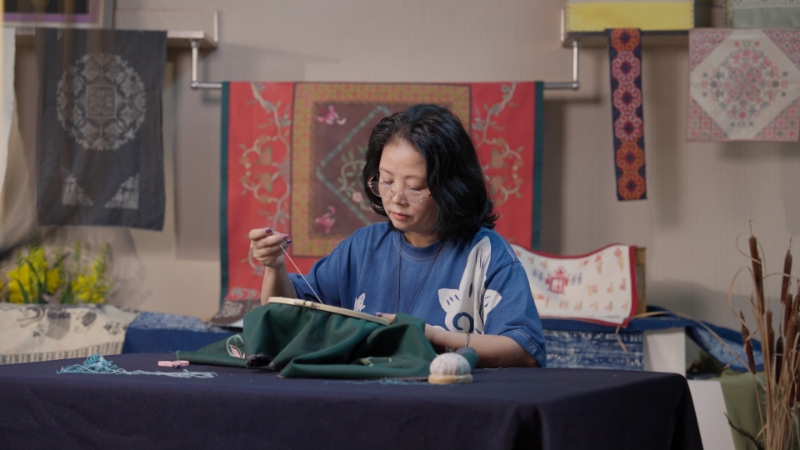 张忠芳与仡佬族刺绣的缘分,开始于2017年的一个仡佬族服装的订单,这也是张忠芳第一次真正接触仡佬族刺绣,她说“它的留白、简约又灵动,一下子打动了我”。从此,她踏上了寻访古老纹样的漫漫长路。从正安的古寨到务川的乡村,她走访了30多个村寨,收集散落民间的老绣片、拓印古建筑上的纹样,甚至复制了百年的“哭嫁帕”。在她的眼中,每一针每一线都不只是图案,而是仡佬族与汉文化交融千年的无声史诗。
