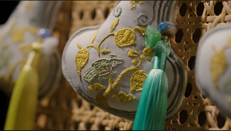 真正让仡佬绣“活起来”的,是张忠芳的大胆创新。她从色彩入手,将原本以深咖为主的传统绣线,拓展为符合现代审美的丰富色系;她让刺绣图案飞出绣片,融入服装、饰品乃至二十四节气香包,成为可佩戴、可收藏的“行走的艺术”。其中,她设计的仡佬族“二十四节气”香包系列,不仅承载着传统文化寓意,更成为走进故宫博物院的“乡村工匠名片”。