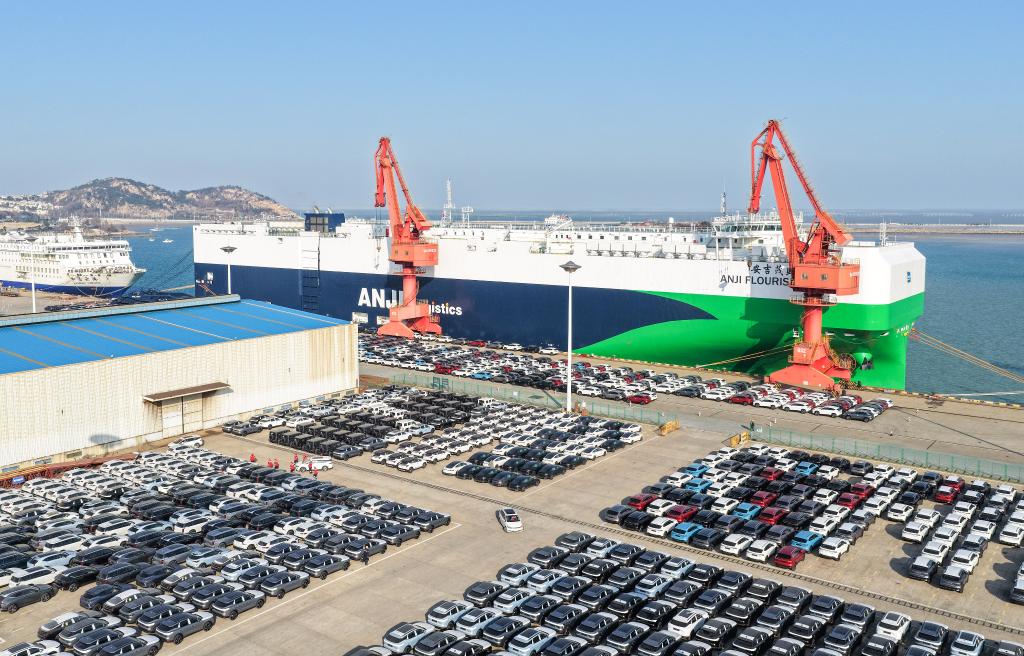2025年12月17日,在江苏连云港港,一艘滚装船在装运出口汽车(无人机照片)。新华社发(王健民摄)