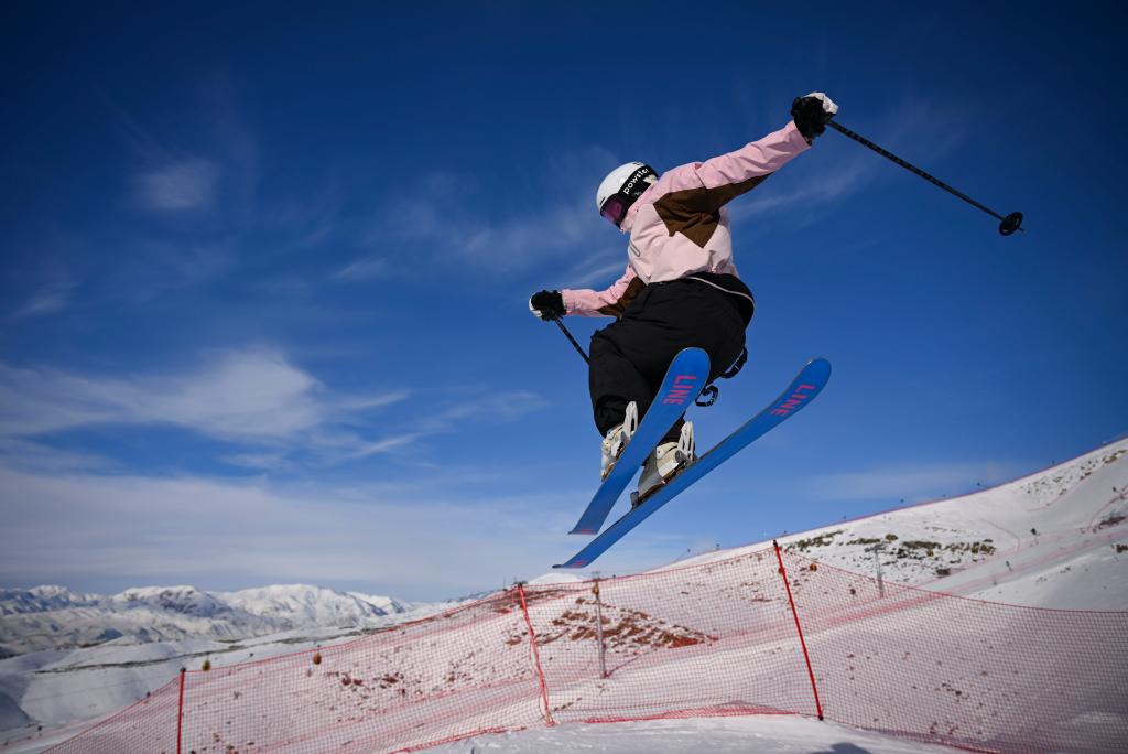 雪友在新疆阿勒泰将军山滑雪公园飞越跳台。新华社记者 胡虎虎 摄