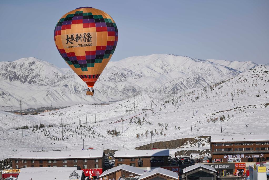 游客在新疆阿勒泰将军山国际滑雪度假区乘坐热气球赏雪景。新华社记者 胡虎虎 摄