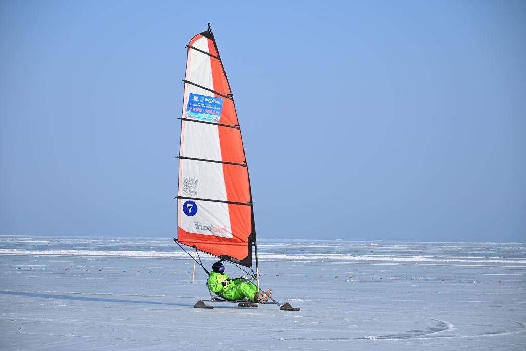 博斯腾湖冰原,参赛选手进行冰帆比赛。新华社发(孙浩天摄)