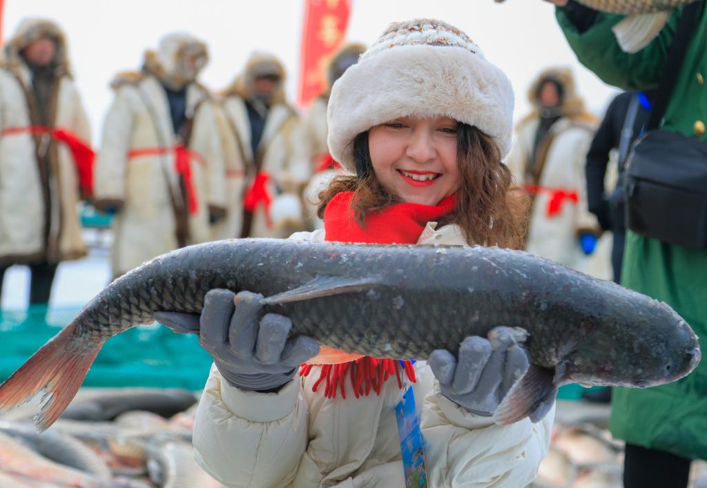 1月18日,在博斯腾湖冰面上,游客手捧刚打捞上来的博斯腾湖鱼。新华社发(年磊摄)