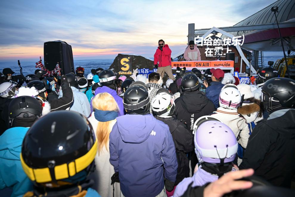 雪友在新疆阿勒泰将军山国际滑雪度假区参加“夕阳派对”。新华社记者 胡虎虎 摄