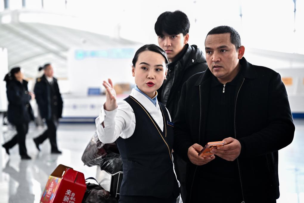 乌鲁木齐天山国际机场,导乘人员为旅客引导方向。新华社记者 辛悦卫 摄