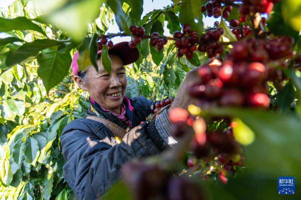 1月23日,咖农在临沧市双江县沙河乡陈家寨村云顶筑巢咖啡庄园采摘咖啡果。