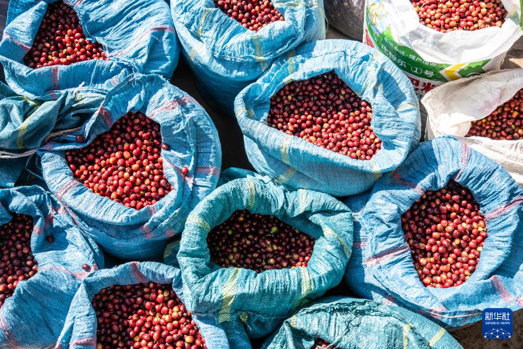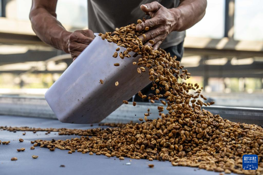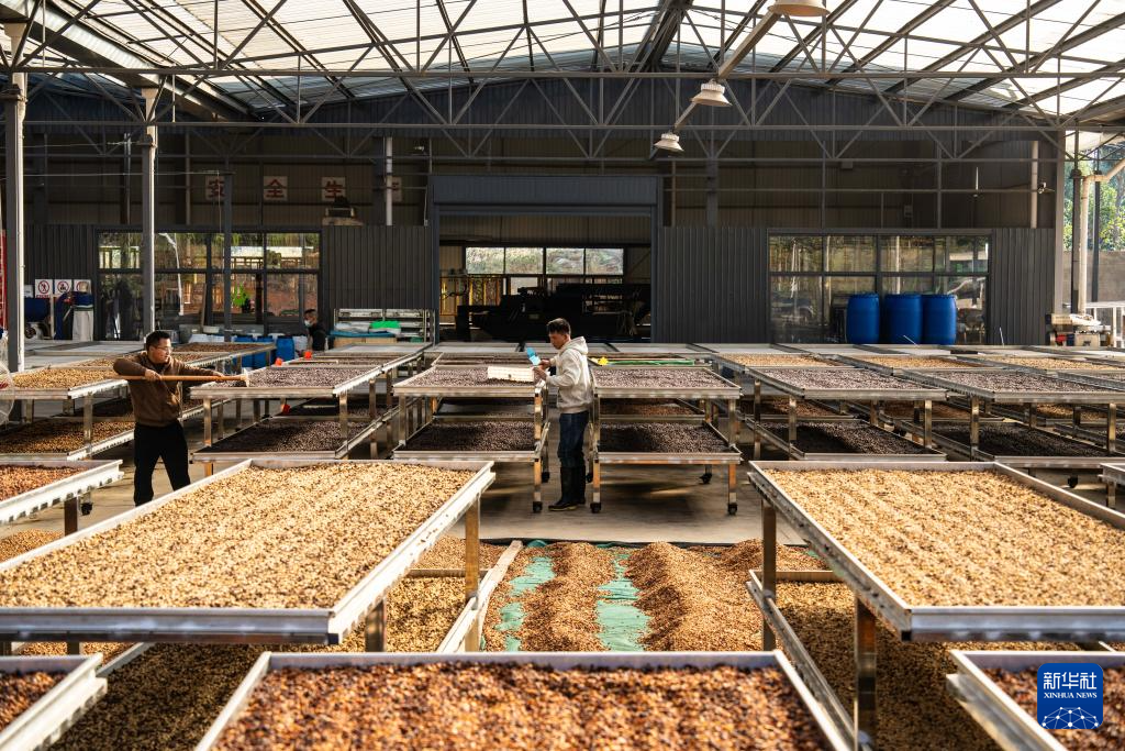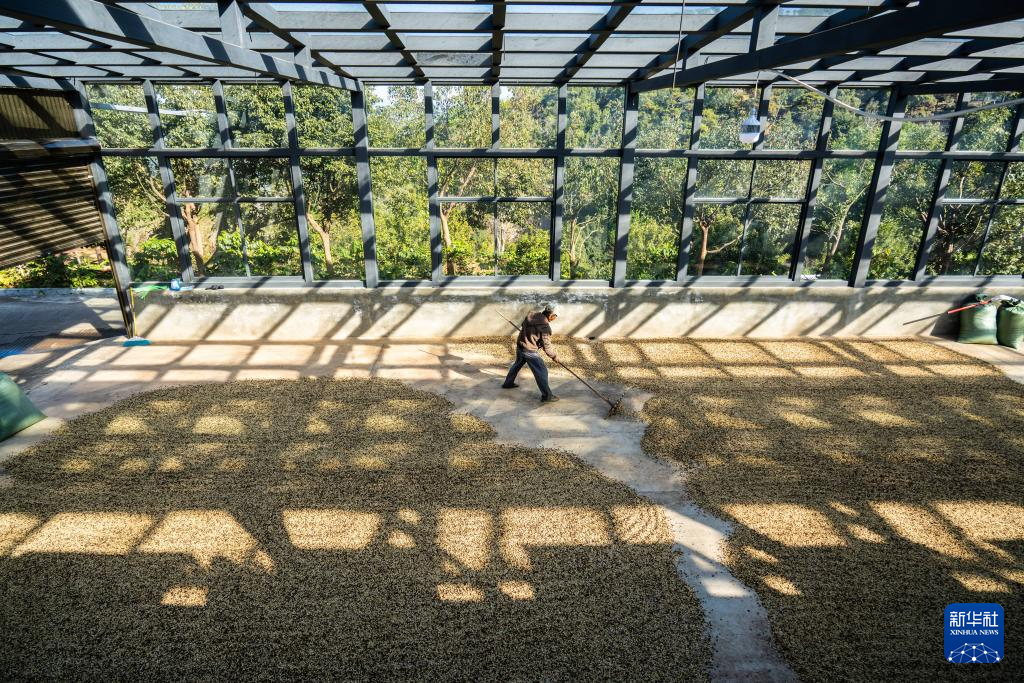 1月23日,咖农在临沧市双江县沙河乡陈家寨村云顶筑巢咖啡庄园晾晒咖啡豆。