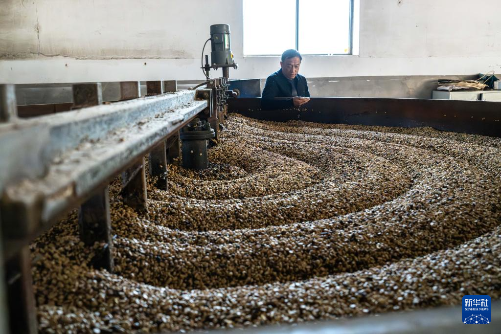 1月22日,咖农在临沧市临翔区圈内乡云佳咖啡庄园查看咖啡豆处理情况。